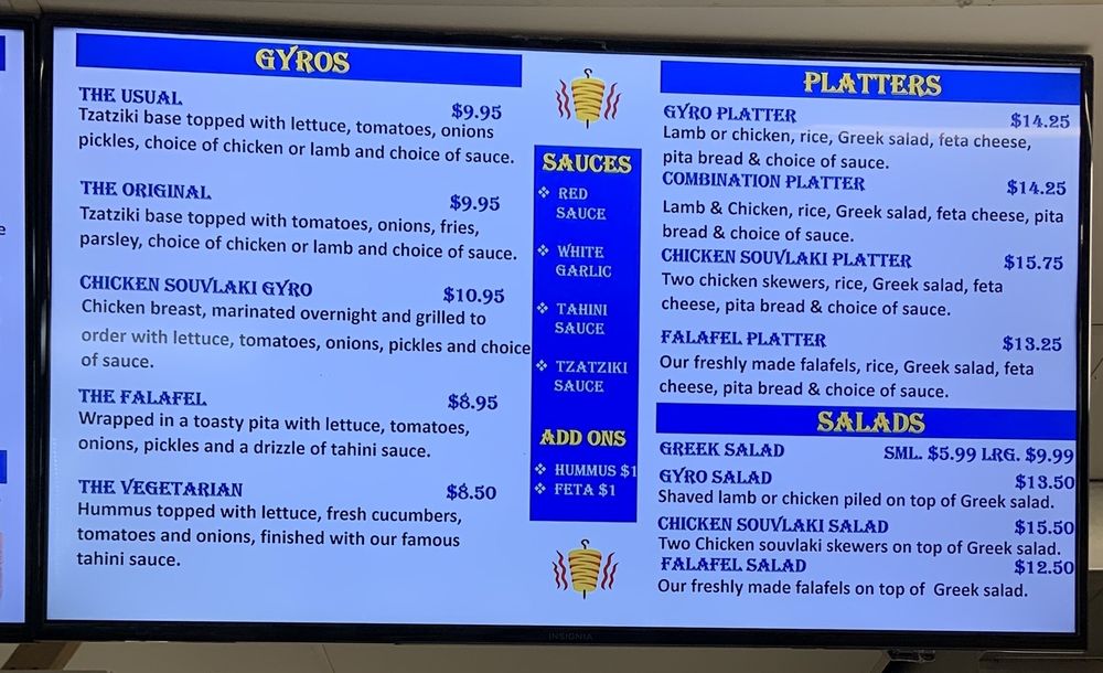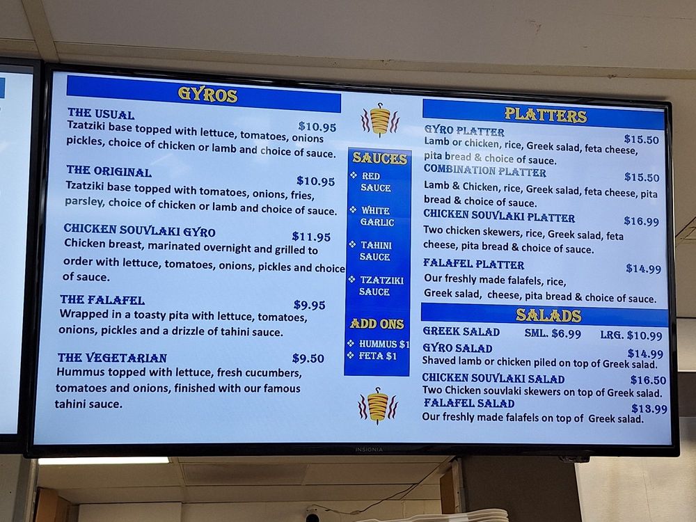 Lamb, rice, Greek salad, feta cheese, pita bread & choice of sauce. Tzatziki Sauce Red Sauce (spicy) White Garlic Sauce Tahini Sauce